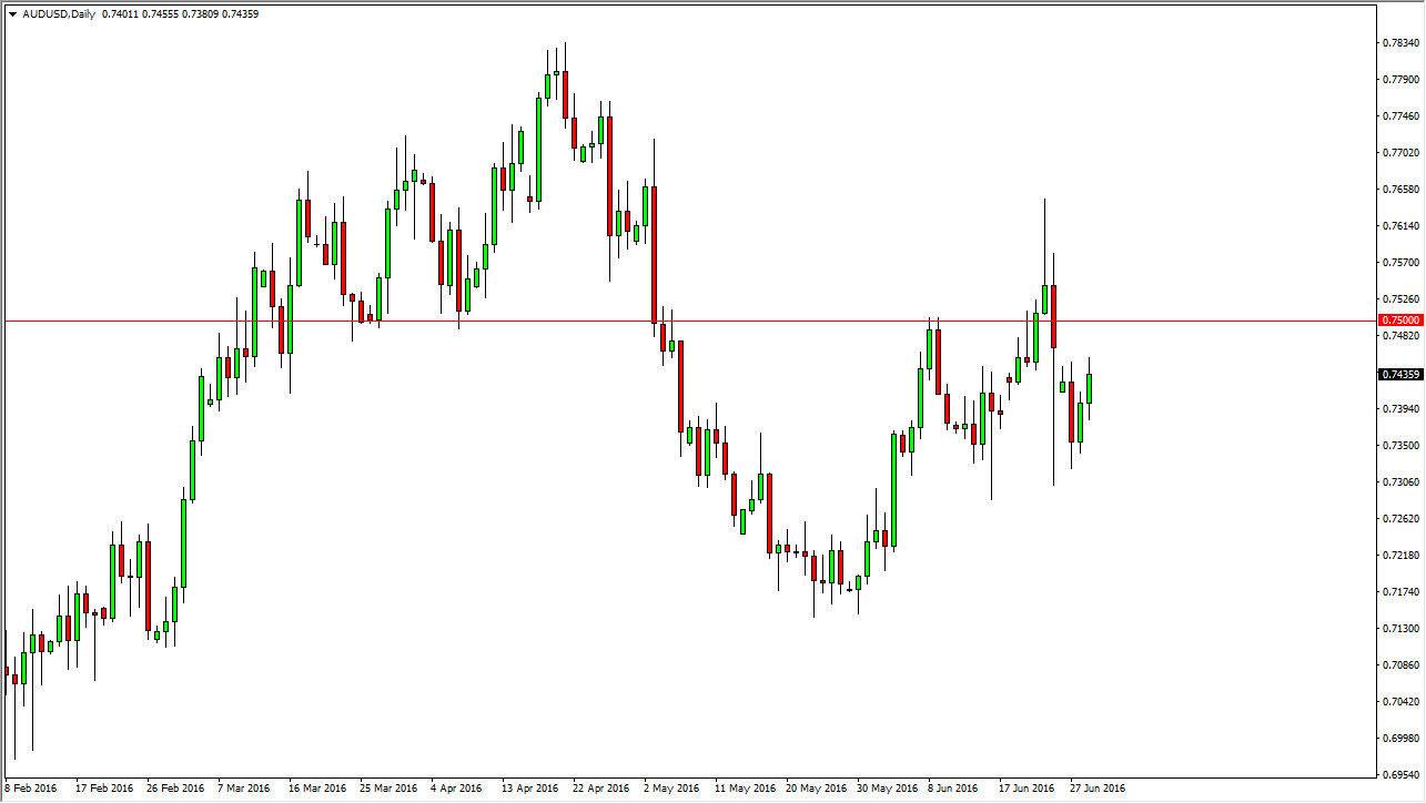 The Australian dollar rose slightly during the course of the day on Wednesday, as the market tried to test the gap and of course the 0.75 level above there. That being the case, the market should continue to be volatile, and perhaps find sellers above. I have no interest in buying the Australian dollar the moment, as I am very cautious about riskier currencies. I would like to sell exhaustive candles if we see them appearing, as I expect they will.