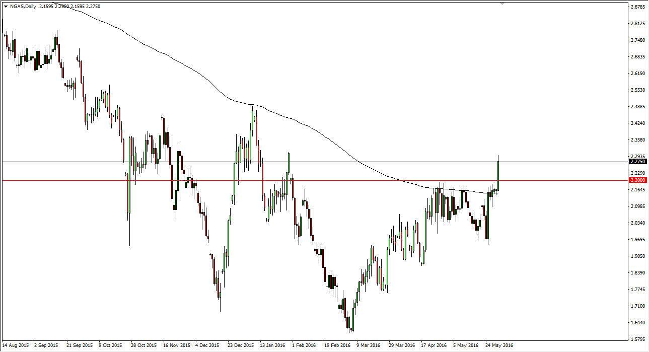 I have to admit that I’m a little surprised by this move, as the natural gas markets broke above the $2.20 level significantly. We are not only above that resistance barrier, but we are well above the 200 day exponential moving average that I have plotted on the chart as well. Because of this, we could continue to go higher, perhaps even as high as the $2.50 level. With this, I believe that short-term pullbacks will end up being short-term buying opportunities as the market will more than likely continue to show quite a bit of volatility.