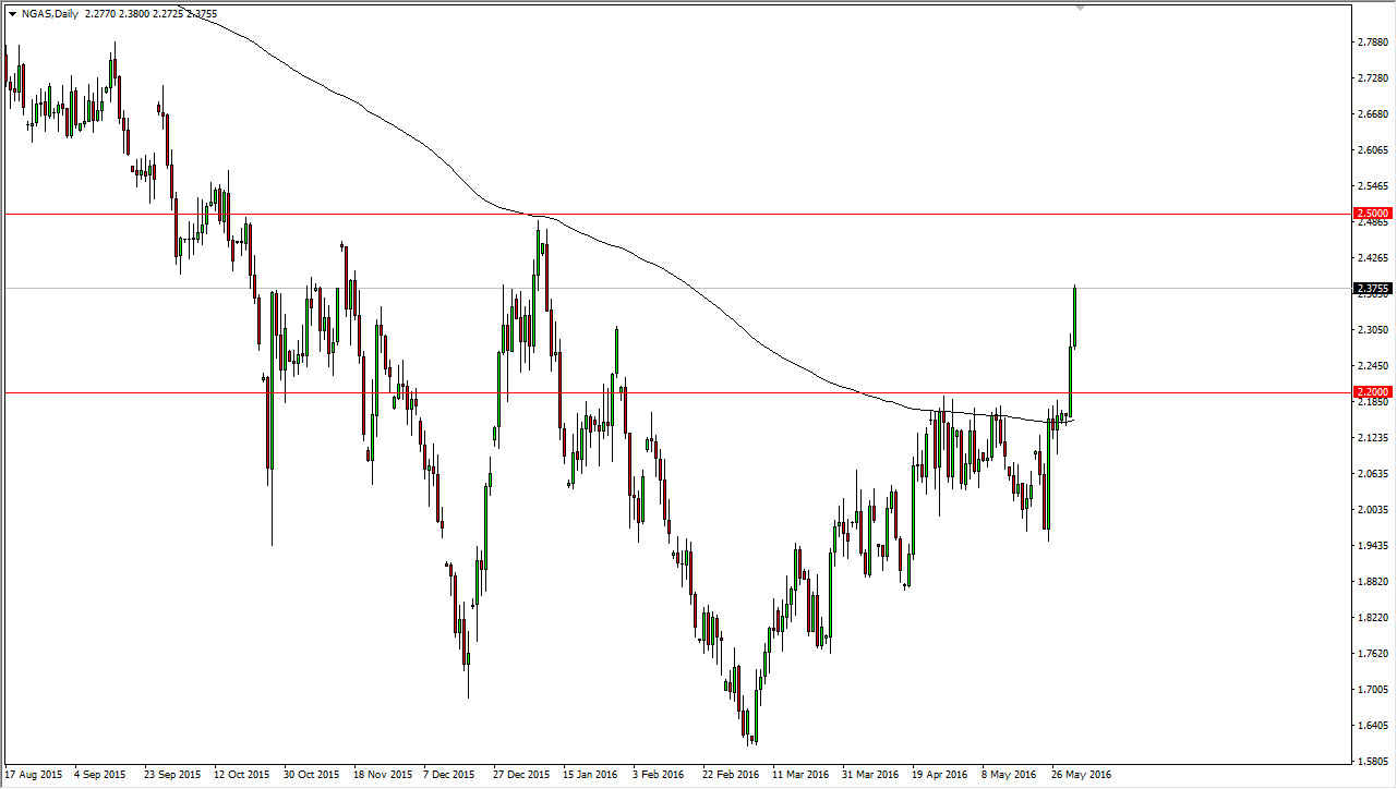 Looking at this chart, it’s pretty amazing how far we have come in just a couple of days. We broke through the $2.20 level, which of course was bullish and then shot straight up in the air. I think at this point in time were going to target the $2.50 level which is the next natural “big figure.” However, I don’t necessarily think we do it in one shot. If we get an exhaustive candle, it could be a selling opportunity but quite frankly the natural gas markets have a lot of negativity to them as sooner or later drillers will come back into the marketplace and start selling on higher prices. In other words, even though we have a “rip off your face” type of rally going on right now, I still think it’s only a matter time before the sellers get involved. This is a market that has been very good to sellers for a very long time, so this significant bounce isn’t much of a surprise. Given enough time I think the sellers returned, but very obviously the buyers are in control at the moment.