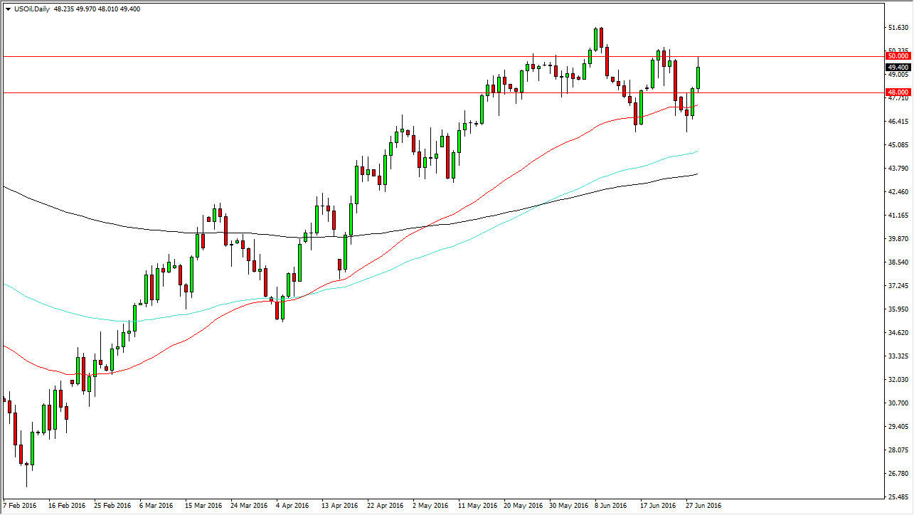 The WTI Crude Oil markets rallied during the course of the session on Wednesday, testing the $50 level. By doing so, it looks as if the market is going to try to break out to the upside but we didn’t close above it. If we can break out above the most recent high, the market then will continue to go much higher. Ultimately, at this point in time it looks quite a bit like we are consolidating, so I feel that we very well could pull back towards the 50 day exponential moving average, which is shown as red on this chart. The market does look as if there is quite a bit of bullish pressure underneath though, so ultimately we could breakout. With this, I think that the short-term pullback could end up being more of a buying opportunity than anything else.