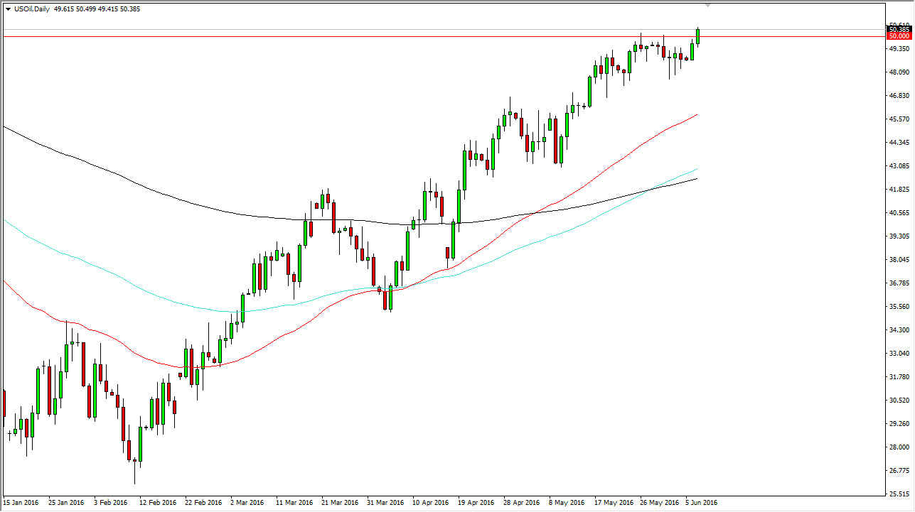 The WTI Crude Oil market broke higher during the course of the session on Tuesday, clearing the $50 level. By closing at the top of the range, it looks like the market should continue to go higher. After all, the $50 level is of course a large, round, psychologically significant barrier. Also, is an area that we have been fighting with for some time, and with that being the case I believe that it’s a sign we will continue to go much higher.