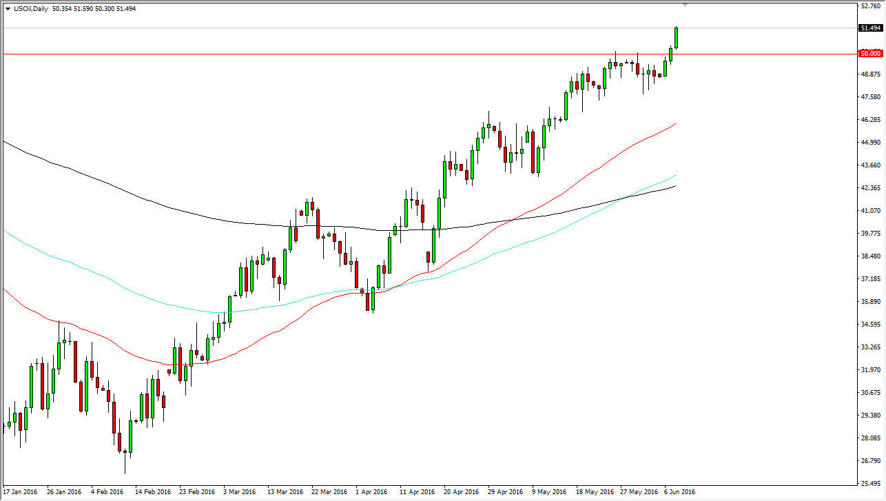 The West Texas Intermediate grade of crude oil broke out during the day on Wednesday, as we have certainly left the $50 region behind. Because of that, this market should continue to go higher as I have that as one of the major resistance barrier to overcome from both a psychological and an actual resistance point of view. The moving averages are all pointing up, and we do have the 50 and 100 day moving averages above the 200 day moving average now. Adding to that is the fact that the market closed at the very top of the range for the day, and with this I believe that the market can only go higher from here. Buying pullbacks and breakouts above the top of the range for the day is how I’m going forward in this market.