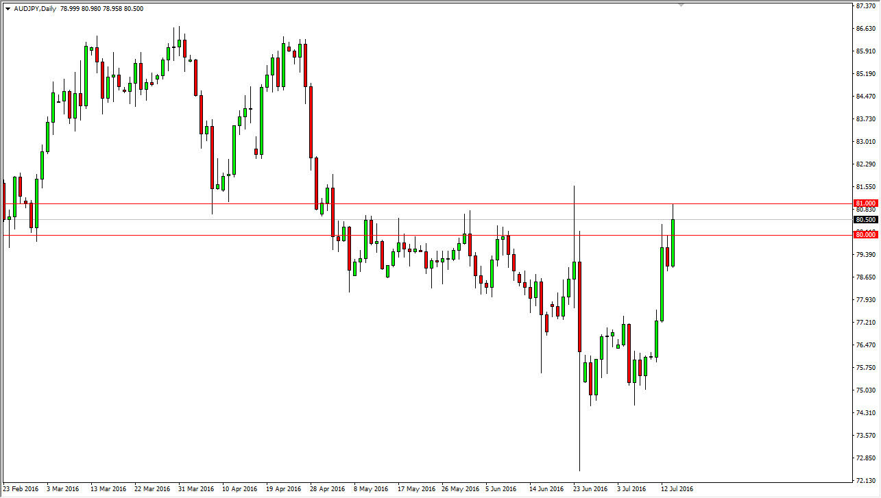 During the day on Thursday, the Australian dollar climbed rather drastically against the Japanese yen, slamming into the 81 handle. I believe that the 81 handle is significant, as it is the top of a “zone” of resistance that we’ve seen in this market previously. If you look at the chart, you can see that there have been several attempts to break above 80 over the last couple of months, but we couldn’t sustain the rally. Every time that we got above 80, we invariably fell back below it.