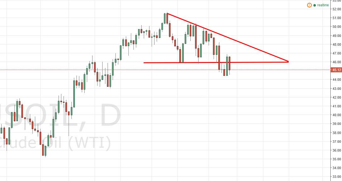 The WTI Crude Well market fell during the course of the day on Wednesday, falling down towards the $45 level yet again. This is a market that I recently considered to be in a descending triangle that has broken down, and as a result I have been bearish for a moment. Because of this, I feel that the market is ready to continue going lower, perhaps reaching towards the $40 level. Any rally at this point in time is a selling opportunity as far as I can see, and signs of exhaustion will be used for me to short this market again and again.