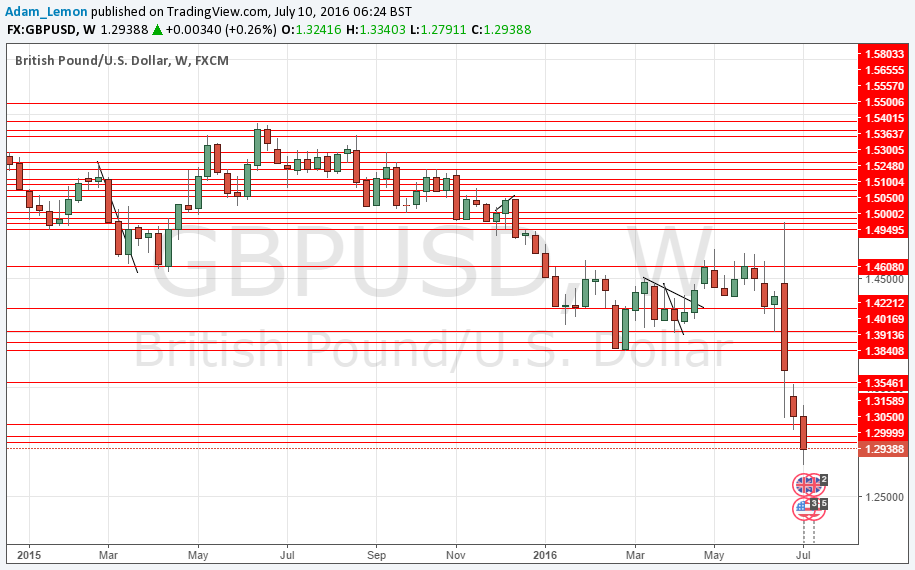 The sheer momentum of the post-Brexit move suggests that the price is quite likely to reach new lows and perhaps finally find some support at a key psychological level such as 1.3000 or 1.2750, at least over the short term.