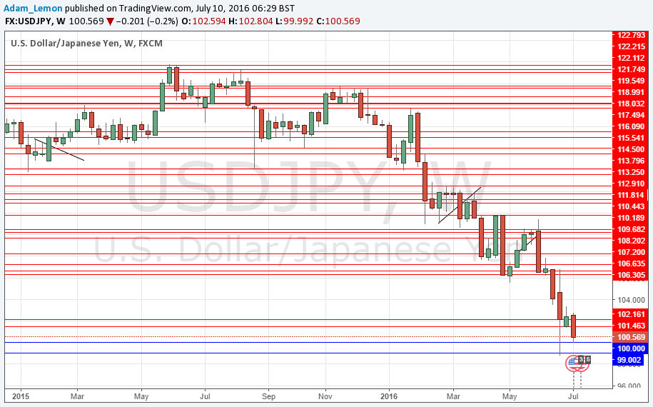 There is a strong downwards trend and the JPY has the greatest long-term strength of all the currency pairs right now. However we can see in the chart below that the low of two weeks ago has still not been exceeded, and that there is some support at around the psychologically key 100 level which has managed to hold.