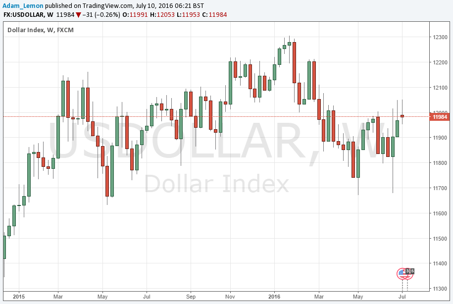 The U.S. Dollar did not really go anywhere last week, printing a small doji candle with a slightly larger upper wick. The price has closed above its level of 13 weeks ago, suggesting that the downwards trend is over. However the action is again suggestive of a resistant cap at 12000.
