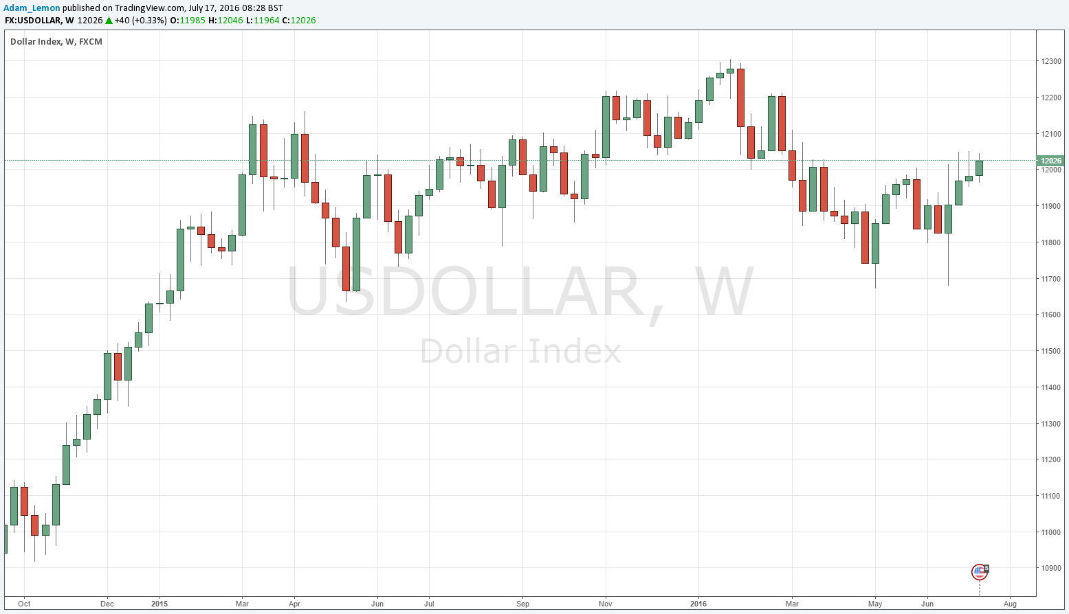 The U.S. Dollar rose last week, printing a bullish inside candle. The price has closed above its level of 13 weeks ago, suggesting that the downwards trend is over. However the action is again suggestive of a resistant cap at 12000.