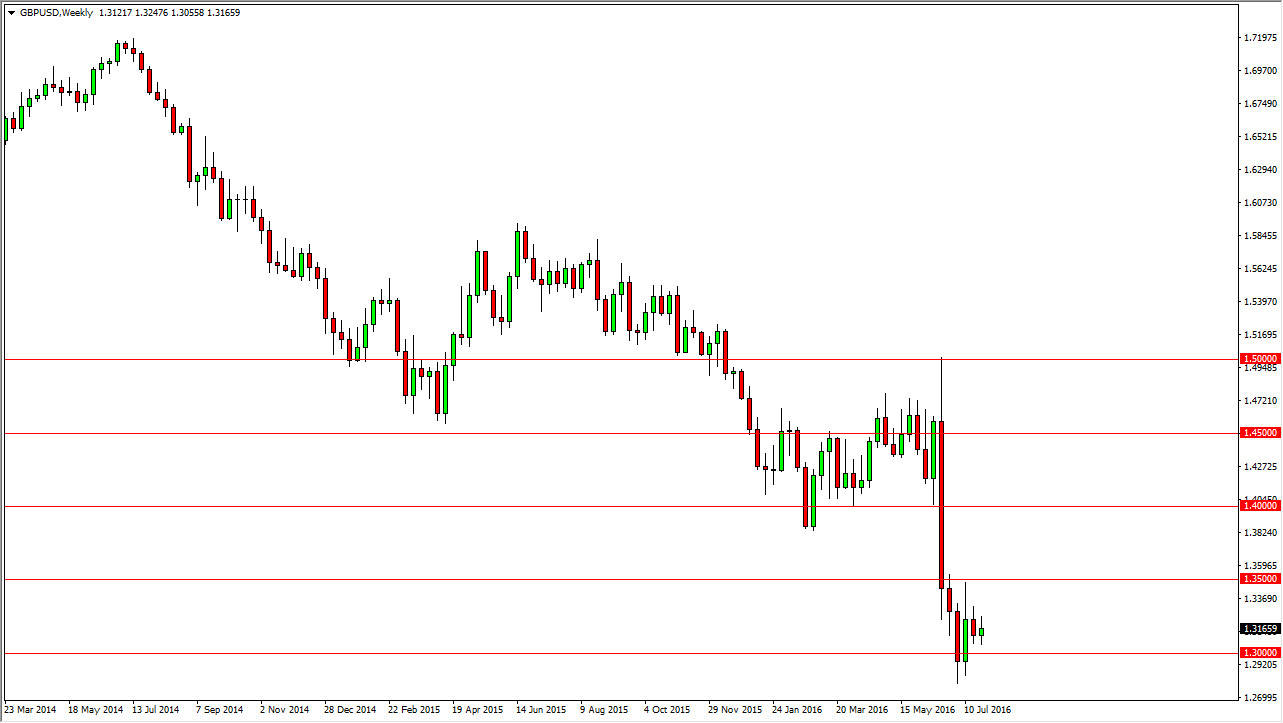 The British pound has been the epicenter of attention by Forex traders for quite some time now, certainly since the British voted to leave the European Union. You can see that we have seen quite a bit of bearish pressure followed by nothing. This is quite often the case, but I believe what we are going to see is some attempt at a bounce and then we will start see sellers again. After all, we are just now starting to get the first signs of economic numbers out of Great Britain after the vote to leave, and we in fact have seen that things are getting a little bit slower. With this, I believe that rallies will continue to offer selling opportunities in this particular market and perhaps other GBP related markets as well.
