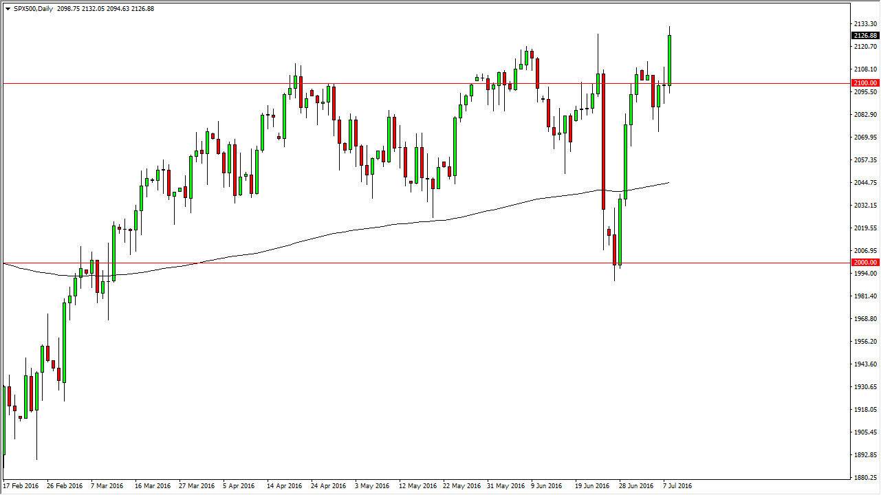 The S&P 500 took off to the upside during the course of the session on Friday in reaction to the stronger than anticipated jobs number. This should continue to be a bullish market in my estimation, because we have been so bullish previously, and now that we have a stronger jobs number, it makes sense that people will be willing to go long of this market. On top of that, now that we have made a fresh, new high at one point during the day, it shows that we are starting to break through a significant amount of resistance. I believe now that the 2100 level below should be a supportive level, and as a result I believe it is essentially the “floor.” I have no interest in selling, and I believe also that we are starting to reach into a “buy-and-hold” type of market.