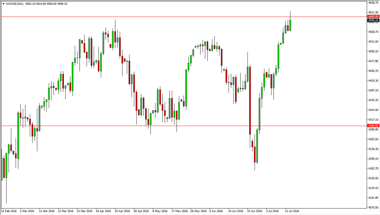 The NASDAQ 100 broke out during the day on Thursday, but did pullback a little bit below the 4600 level. I think eventually we do continue to go higher though, because quite frankly out to the 3 major US indices that we follow, this is the only one that hasn’t broken out cleanly. It has been a bit of a laggard, but ultimately I think that it will follow the S&P 500 and the Dow Jones Industrial Average given enough time. A break above the top of the range during the Thursday session is reason enough for me to go long, and I believe the supportive candles on a pullback should also be thought of as buying opportunities as well. We are bit overextended at the moment, so it makes sense that perhaps we struggle little bit here, only to eventually show signs of massive strengthen later.