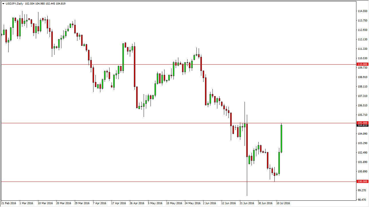The US dollar skyrocketing against the Japanese yen on Friday, breaking towards the 105 level. This is an area that we have quite a bit of resistance that, due to the fact that a couple of weeks ago we had seen some type of resistance. I believe that there is a massive amount of resistance above the 105 level, and extending all the way to the 106 level. So in other words, even though we have a very bullish candle for the day on Tuesday, it is likely that we may need to pull back in the short-term in order to start buying. After all, the market is now concerned about the Bank of Japan intervening, as I had suggested just a few sessions ago. With this, it looks like we are going to go higher given enough time but a pullback may be needed in order to build up the momentum to break out.