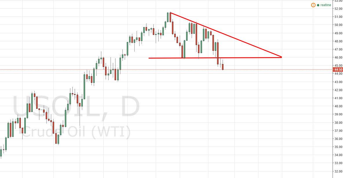 The WTI Crude oil market initially bounced during the day on Monday, but found quite a bit of resistance at the $46 level, which had been so supportive previously and what I have drawn as a bit of a descending triangle. Yes, it’s not the best triangle, but most certainly the $46 level has had quite a bit of interest by the market, so having said that it makes sense that we turn right back around and fell. We have now started to roll over and I feel that we are reaching towards the $43 level next. If we can break down below the $43 level, we should then reach down to the $40 level in my estimation as this market most certainly is getting a bit heavy at this point.