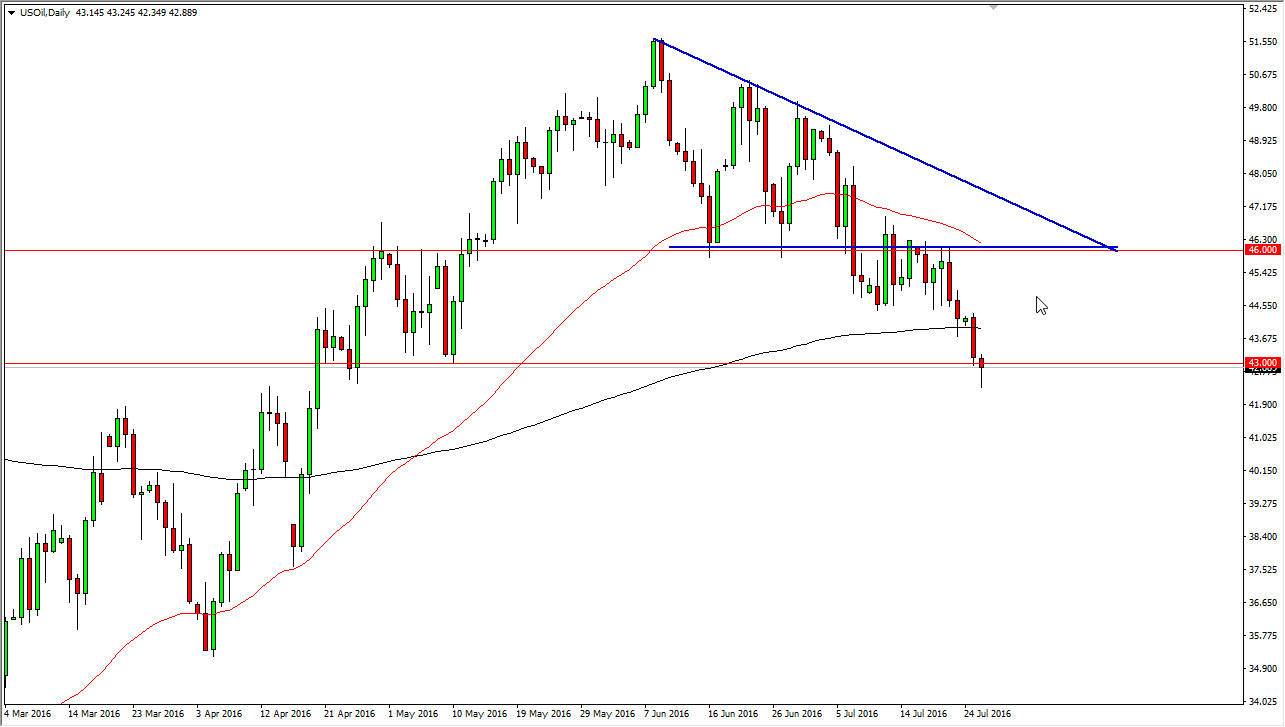The WTI Crude market fell during the day, breaking significantly below the $43 level at one point. However, we turned around and formed enough support to end up printing a hammer. This of course is a bullish sign and it makes sense considering that we have the Crude Oil Inventories number coming out during the day, and that of course will have a massive effect on what happens with the oil market. With this, it makes sense that perhaps sellers decided to take profits. I believe that any bounce at this point in time will eventually offer a selling opportunity though, and with that signs of exhaustion would be a nice opportunity to sell. If we break down below the bottom of the hammer, that is also a very negative sign and would have me selling just as quickly.