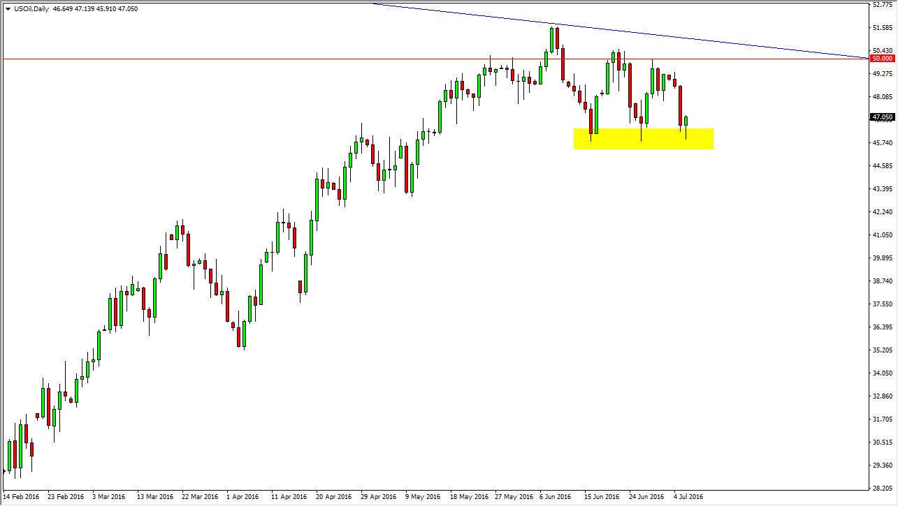 The WTI Crude Oil market initially fell during the day on Wednesday, but as you can see we turned around to form a bit of a hammer. The $46 level below continues to be very supportive, and therefore it’s not a surprise that we bounced. However, we have seen quite a bit in the way of resistance above, as the highs keep getting lower. With this being the case, I think it’s only a matter of time before we break down but it appears based upon the hammer that form during the day on Wednesday that we are not quite ready to fall apart yet. Because of this, I believe that we are going to rally only to turn around and selloff yet again. If we do break down below the $46 level though, this market could continue down towards the $43 handle at this point in time. Currently, I believe that the $50 level above is massively resistive.