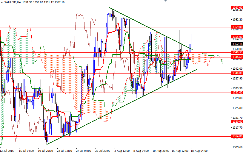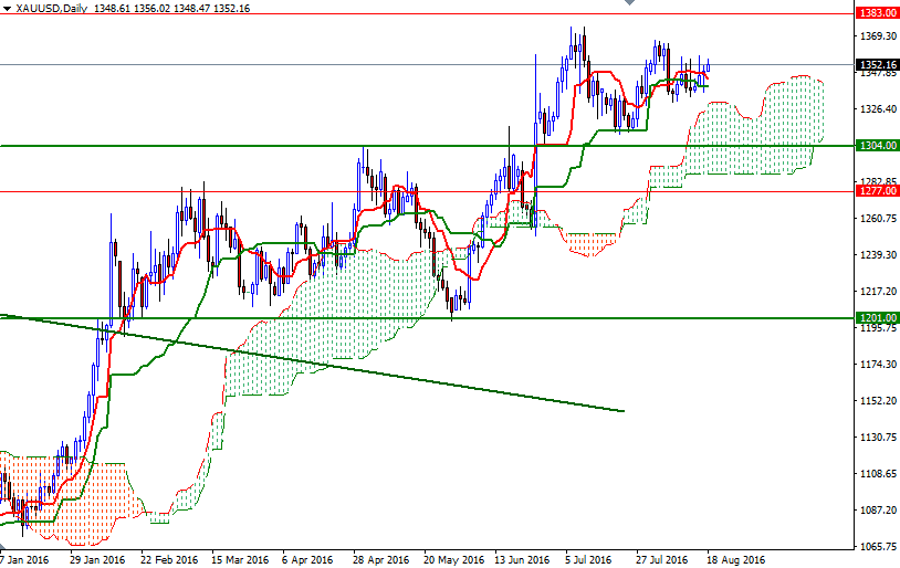 Gold prices ended Wednesday’s session up $2.22, marking the third consecutive rise, after minutes from the Federal Reserve’s July 26-27 policy meeting cast further doubt on the possibility of an imminent rate increase. The minutes showed that policy makers were generally upbeat about the U.S. economic outlook, though they agreed that more economic data is needed before taking another step in tightening monetary policy. The XAU/USD pair traded as high as $1356.02 an ounce before pulling back to the current levels.