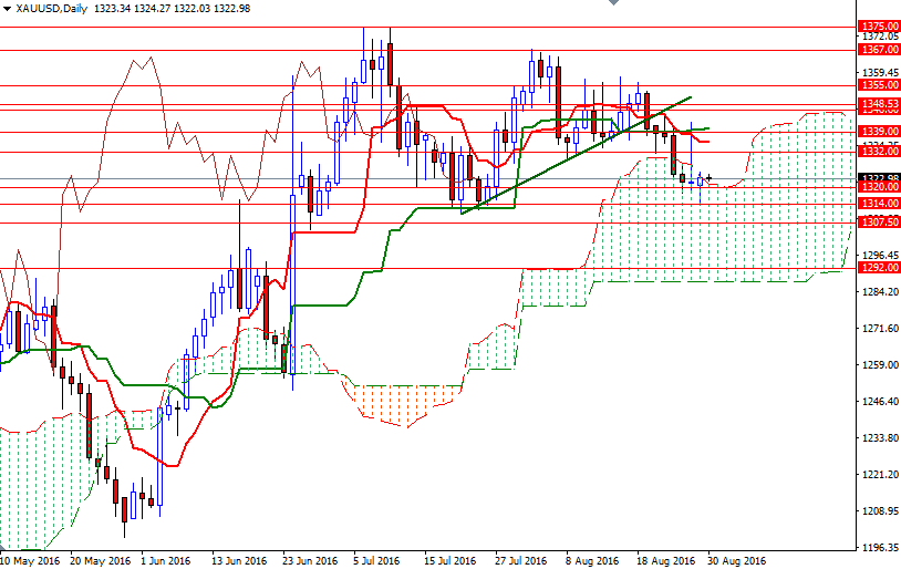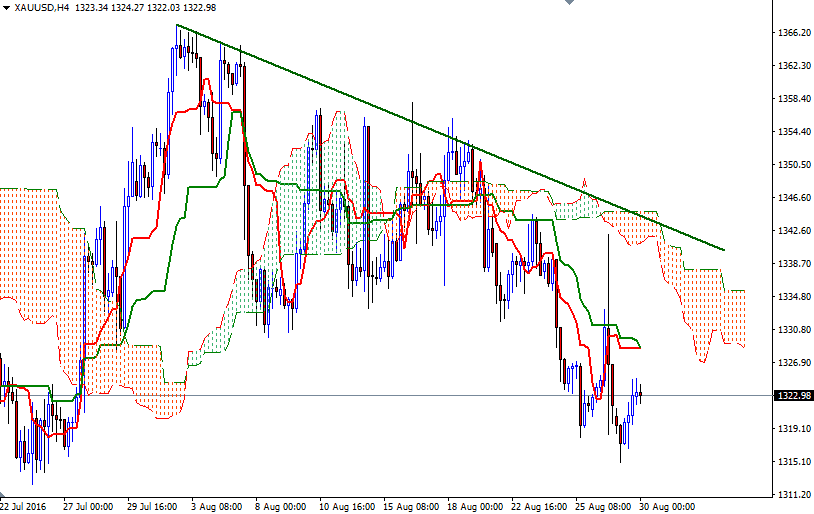 The week offers a big batch of news on the U.S. economy, headlined by the August non-farm payrolls report. Other highlights include consumer confidence, manufacturing PMI, factory orders and housing data. On the weekly chart, XAU/USD remains above the Ichimoku cloud, suggesting that prices have a tendency to rise over the medium-term. However, the market is trading below the 4-hourly cloud and we have bearish Tenkan-sen (nine-period moving average, red line) - Kijun-sen (twenty six-period moving average, green line) crosses on both the daily and H4 charts. I think the area between 1314 and 1304 (a support that held the market up back in July, and now it is fortified by the daily cloud) will play an important role going forward.