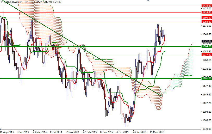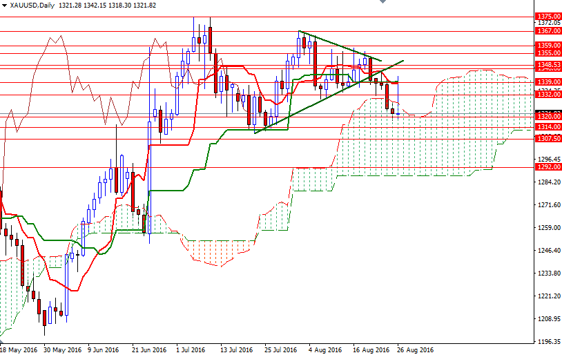 In my previous analysis, I had pointed out the possibility of a move towards 1300 on a break below the ascending trend line (the lower line of the triangle shown on the daily chart). If prices can't climb back above the 1332/0 zone, the market will probably visit the 1314 and 1307.50-1304 support. In that case, the outcome of the next test of 1307.50-1304 should confirm what will happen next. While a failed assault on this support could be a good place to seek a long trade (for a rebound to the 1320 level), a successful drop would make me think that the bears will be aiming for 1292 and 1287.40, which happens to be the bottom of the daily cloud. Closing beyond 1332/0 might see a push up to the 1340/39 region, where the daily Tenkan-sen (nine-period moving average, red line) and Kijun-sen (twenty six-period moving average, green line) lines converge. If XAU/USD breaks up above 1340, it would be a sign of a bullish recovery and open a path to the next barrier in the 1348.53-1346.60 area.