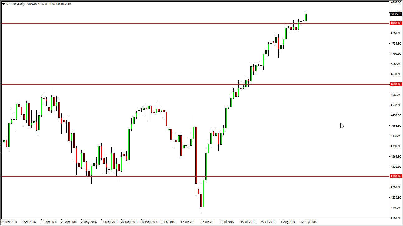 The NASDAQ 100 broke out to the upside during the course of the day on Monday, as we are clear of the 4800 level. I believe that this market is eventually going to try to reach towards find thousand given enough time, but I think that there would also be plenty of pullbacks between here and there that we can pay attention to and use as “value” in this market as we should continue to go higher. I have no interest in selling, and I believe that there is a significant amount of support just below at the 4800 level, which could very well offer a bit of a “floor” in this market.