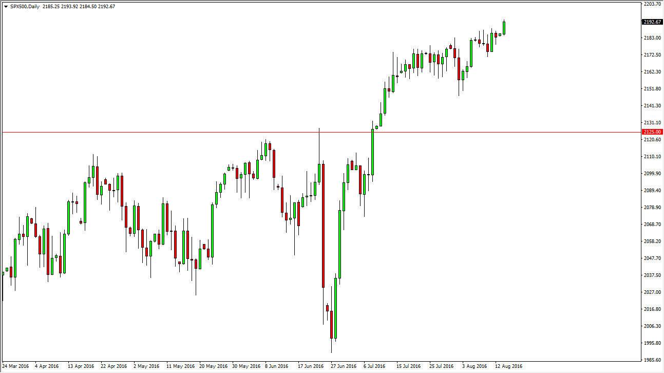 The S&P 500 rallied during the course of the session on Monday, as we continue to see buyers step into this marketplace. The 2200 level of course is a large round number that will attract interest by traders around the world. I believe that as we pullback we should find plenty of buyers below, as we have seen such a nice uptrend. I have no interest in selling this market, because quite frankly the US indices in general look very healthy, and of course will continue to attract money in a very low interest-rate global environment. On top of that, the US economy is considered to be one of the stronger economies out there, so it makes sense that the buyers continue to take advantage of value when it appears.
