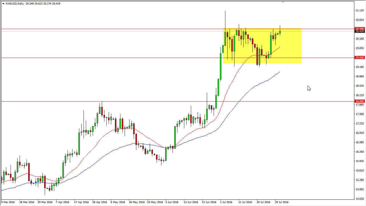 Silver markets have seen quite a bit of bullish pressure due to the fact that a lot of people are concerned about owning Euros or Pounds, as the markets will of course continue to shun both of those currencies given enough time due to the fact that the British have voted to leave the European Union, and of course the European Union itself doesn’t necessarily look like the strongest economy out there. In other words, people are more interested in owning a stronger currency instead of those. And beyond that, it has people buying silver and gold in those currencies, which has a knock on effect over here.