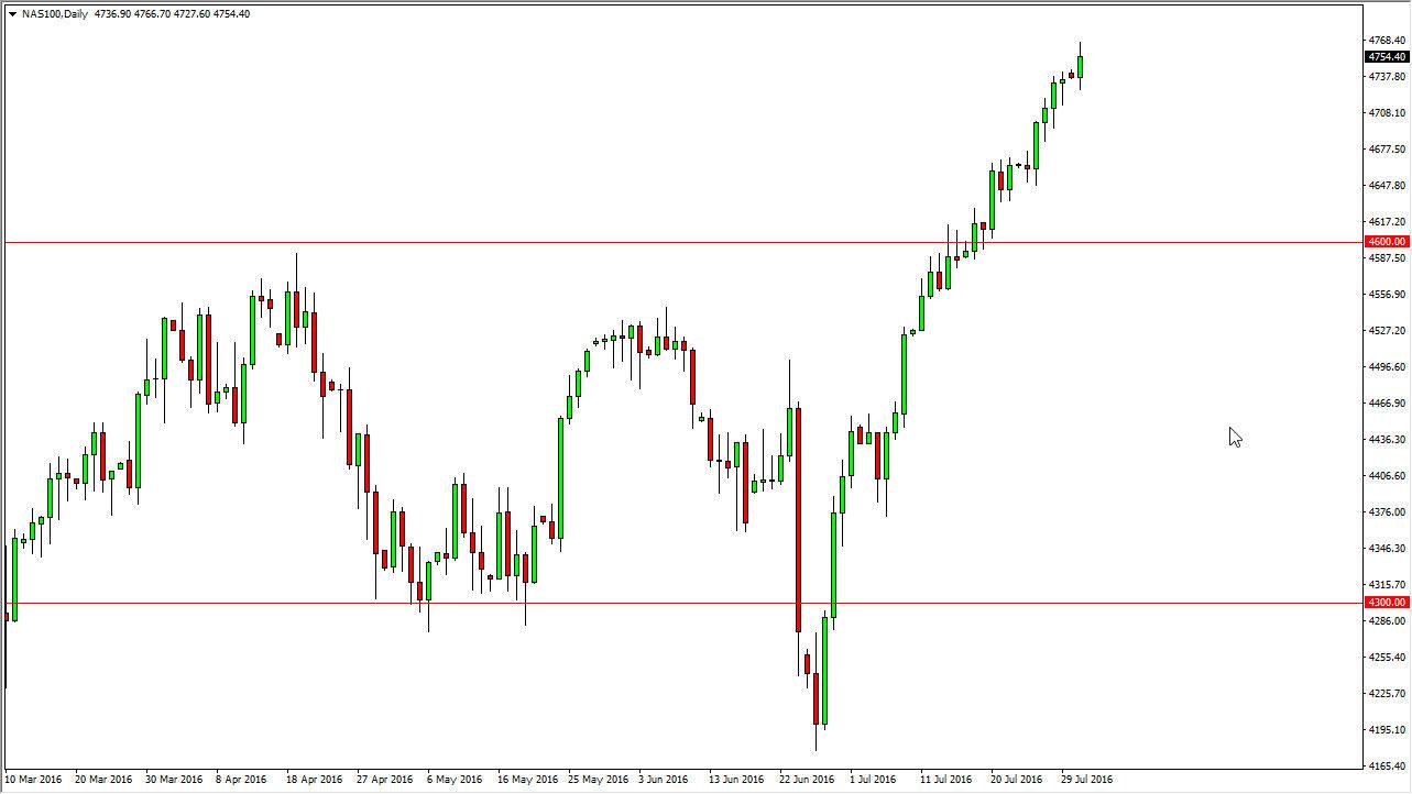 The NASDAQ 100 rose during the course of the session on Monday, but initially found a bit of negative pressure. That being the case, I believe that we are going to continue to go to the upside and I have no interest in selling. However, there is a bit of concern because we are overextended, so I would like to see some type of pullback it would offer “value” in this market that is obviously bullish. With this, I am actually waiting for those pullbacks in order to get involved and on the sidelines. I have no interest in selling, and would completely ignore selling signals at this point in time.