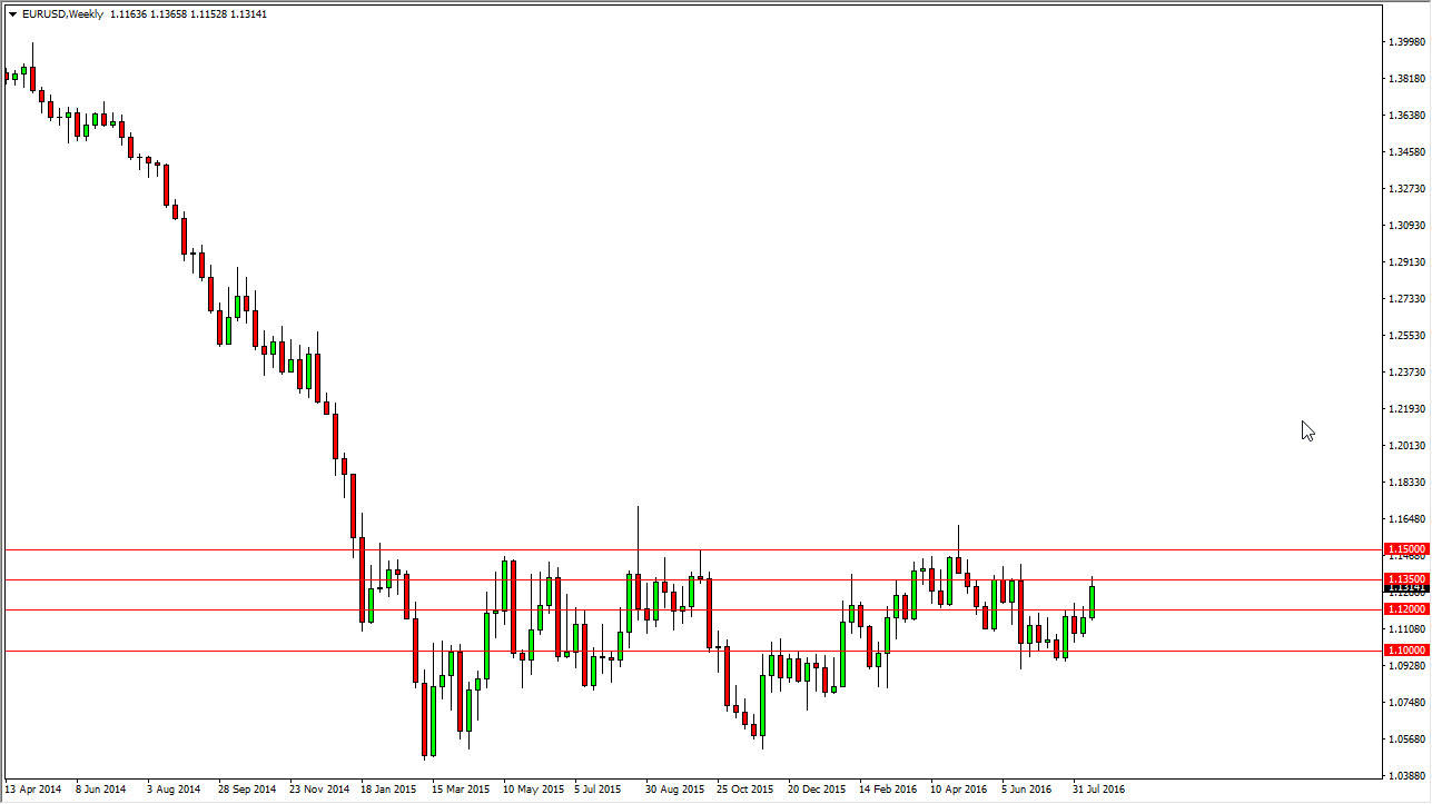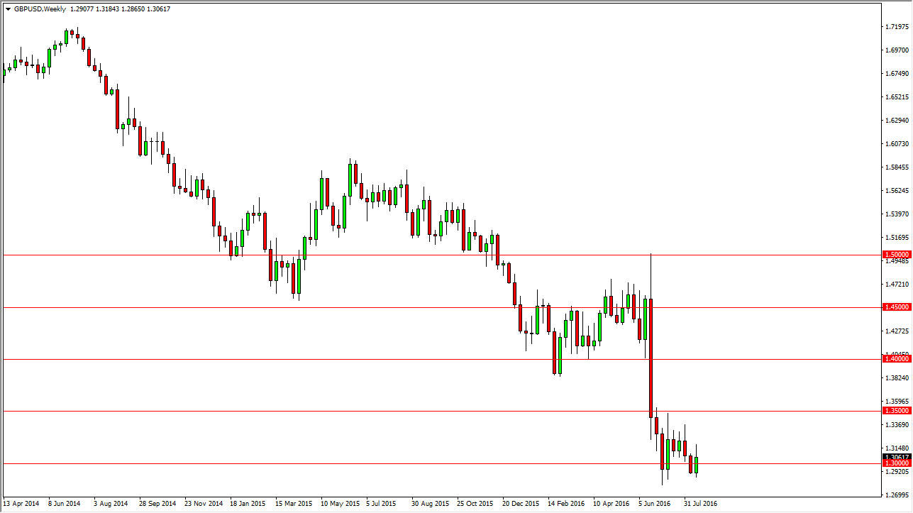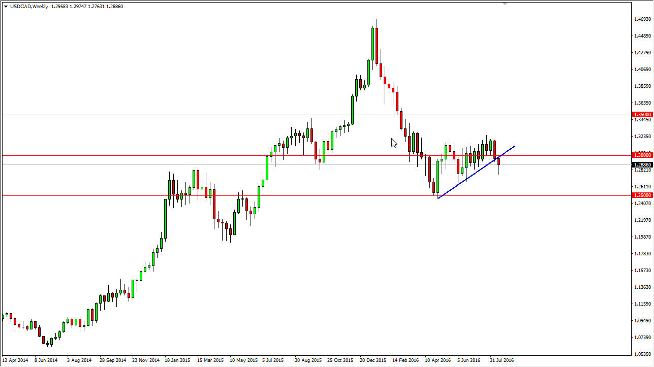 This is probably the most interesting weekly chart to me right now. We did up forming a hammer during the course of the week which of course is bullish, but it’s just after a break down below a significant uptrend line. With this being the case, I think we break above the 1.30 level, the longer-term uptrend continues and we go much, much higher. However, if we break down below the bottom of the hammer, I feel that we drift down to the 1.25 level.