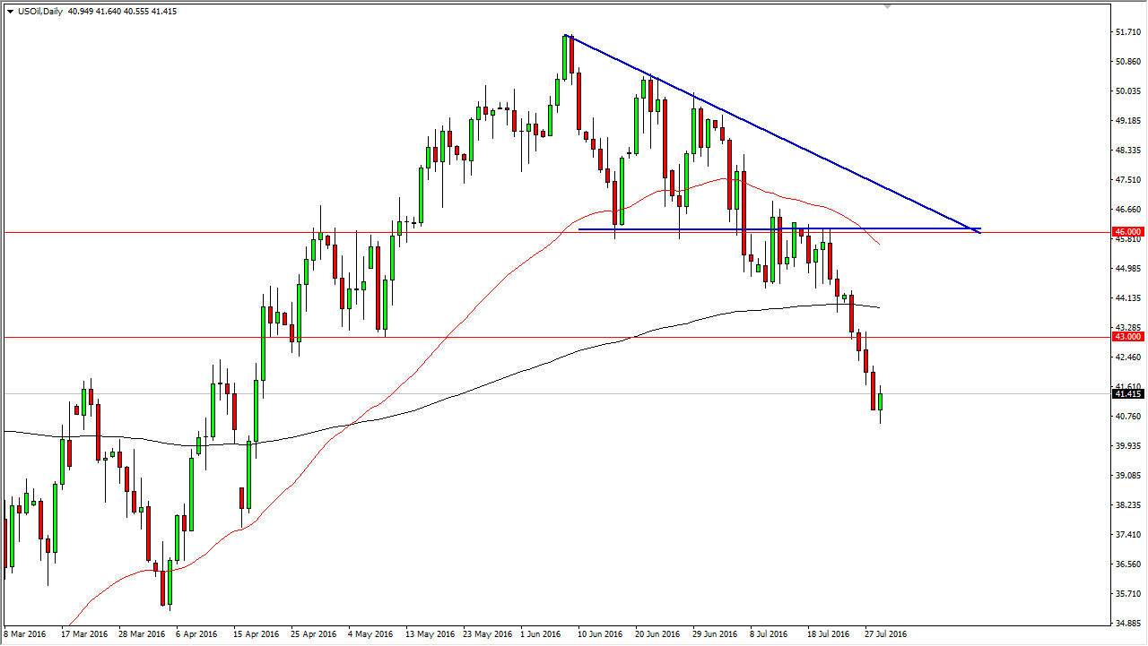 The WTI Crude Oil market initially fell during the day on Friday, but turned around to bounce and form a slightly positive candle. Nonetheless, there is quite a bit of negativity in this market and it seems very likely that we will continue to go to the downside. Because of this, I’m waiting to see signs of exhaustion that I can take advantage of, and start selling yet again. I believe that the $43 level above is going to be a bit of a ceiling, and it’s only a matter of time before sellers get involved between here and there. I believe that the market will try to break down below the $40 level, but it may take a couple of attempts as it is a large, round, psychologically significant number.