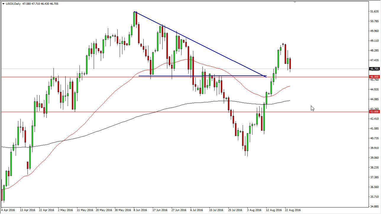 The WTI Crude Oil markets fell during the course of the day on Wednesday, reaching towards the $46 level. I expect to see quite a bit of support there though, so at this point in time I have no interest in selling. Because of this, I’m waiting to see whether or not we get some type of supportive candle or a bounce that we can take advantage of in a market that has shown quite a bit of support recently. With that, I’m on the sidelines and waiting to see on short-term charts signs that the buyers have returned. I don’t have any interest in selling until we break down below the $46 level, which at that point in time I would anticipate the market would then reach towards the $45 handle. Volume just isn’t there the moment, so you would be forgiven for simply standing on the sidelines.