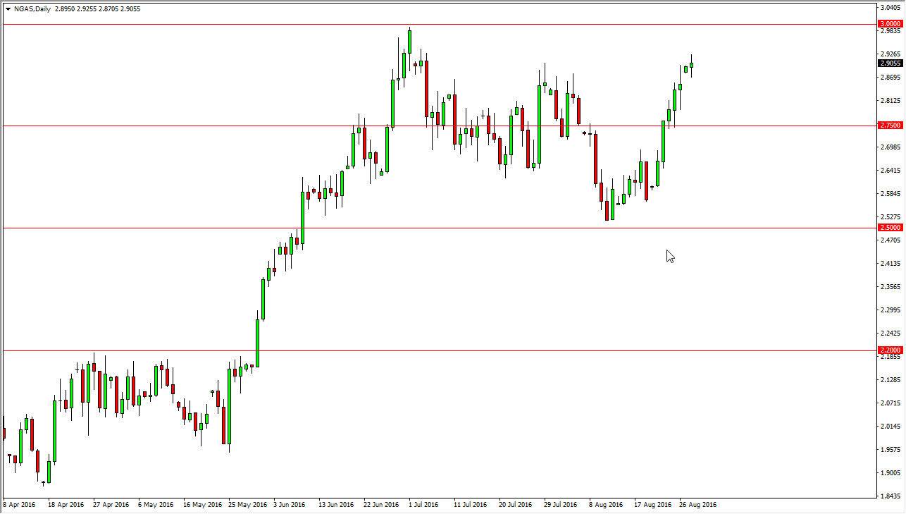 The natural gas markets gapped higher at the open on Monday, slamming into the $2.90 level. This is an area that begins a significant amount of resistance, extending all the way to the $3 level. At this point, it’s likely that the market will find some type of exhaustive candle that we can start selling above there, as the market will have most certainly gotten a bit overexposed and overextended. A break above the $3 level would be massively bullish, and would more than likely change the complexity of this market going forward. However, we are getting close to the end of the summer cooling season in the northeastern part United States, so we could very well see a dip in demand.