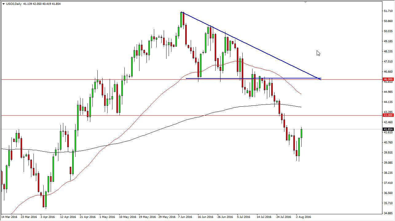 The WTI Crude Oil market initially tried to fall during the session on Thursday, but turned right back around to form a hammer. The hammer of course is a very bullish sign but I feel that more than likely what we’ve seen is some type of short position covering ahead of the Nonfarm Payroll Numbers coming out today. I believe that the $43 level above is a massive barrier, and that the 50-day exponential moving average above pictured in red, should very well reach towards the 200-day exponential moving average pictured in black, and cross. Once we get that happening, that is a longer-term sell signal. In other words, I am simply waiting for some type of exhausted candles I can start selling.