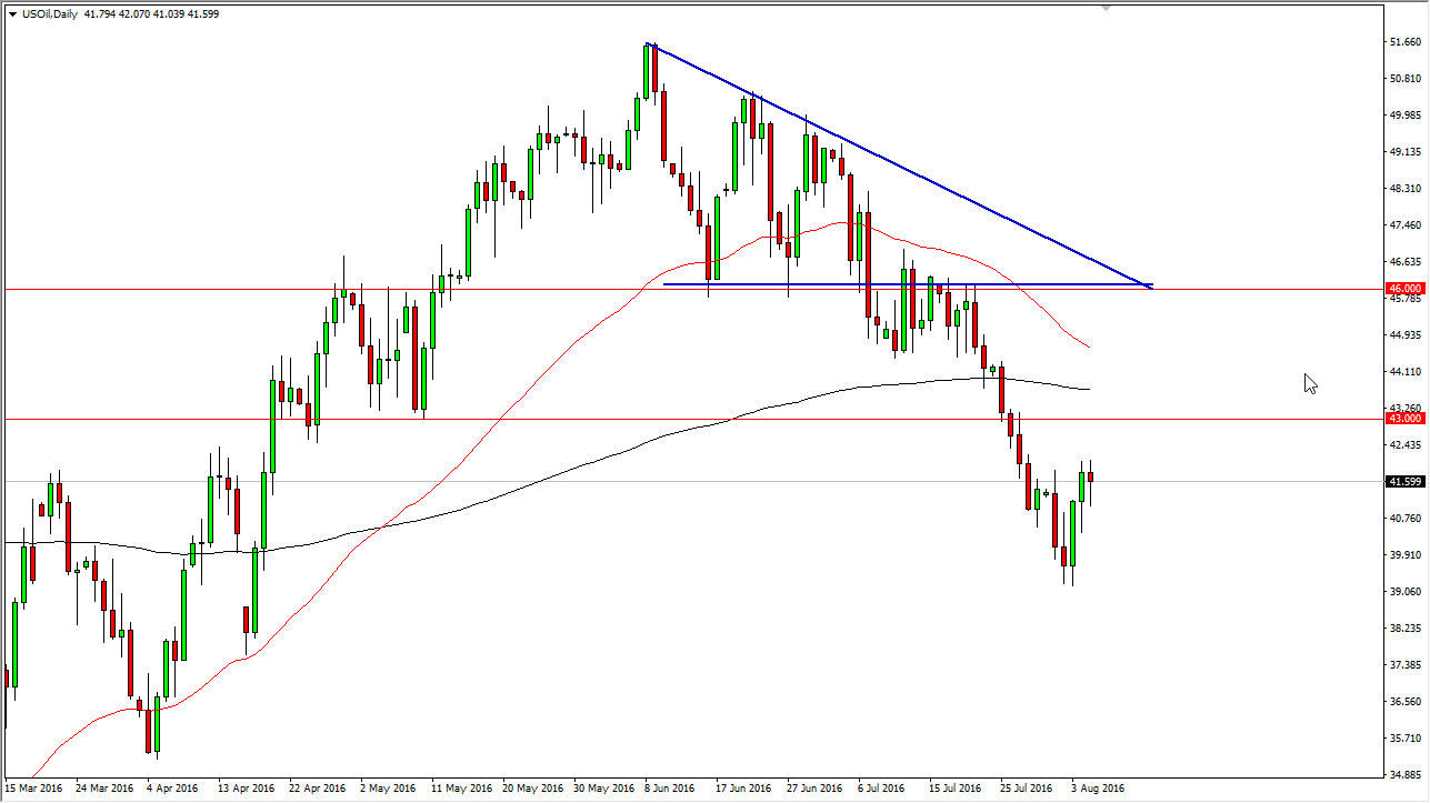 The WTI Crude Oil market initially fell during the course of the session on Friday, but bounced enough to form a nice-looking hammer. That being the case, looks as if we could go higher from here, but I see a significant amount of resistance just waiting at the $43 level above. With this being the case, an exhaustive candle would be reason enough to start selling. I have the 50-day exponential moving average marked in red on the chart, as well as the 200-day exponential moving average. They look like they are about to cross given enough time, so having said that I think it’s only a matter time before the sellers return to this marketplace and continue the downtrend. On the other hand, a break down below the bottom of the hammer for the session on Friday would also be a nice selling opportunity.