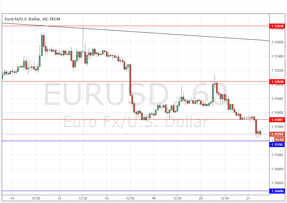 Yesterday saw a bullish pull back to make a peak high with a textbook bearish pin candle rejecting the identified resistance level at 1.1204. Since then, the price has fallen off steadily and at the time of writing is just a few pips above a key support level at 1.1120 having already broken through another level of potential support a little way above that.