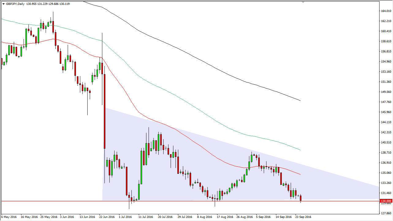 The GBP/JPY pair fell significantly during the day, as we did go below the 130 handle. However, we bounced back above there during the day, showing that the 130 level is going to continue to be very supportive. A break down from here could be a negative sign, and I believe that if we can continue to go lower than the original attempt to break down during the day, we could see this market reach down to the 125 handle. Because of this, I believe that it is only a matter of time before we break down, but we may have to attempt it a couple of different times. Because of this, I believe that rallies offer selling opportunities, especially considering the fact that we been punishing the British pound for the exit vote for some time now.