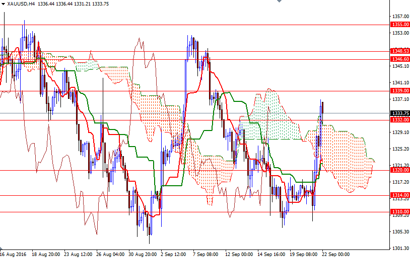 Gold prices rose $20.63 on Wednesday to settle at their highest level since September 9 after the Bank of Japan decided to scrap its focus on monetary base and set targets for long-term rates and the Federal Reserve left monetary policy unchanged. The Federal Reserve cut the number of rate increases expected in 2017 and 2018 but signaled it could hike rates by year-end. Fed Chair Janet Yellen, speaking after the central bank's latest policy statement, said “We judged that the case for an increase has strengthened but decided for the time being to wait.” The XAU/USD pair traded as high as $1336.95 an ounce before pulling back to the current levels.