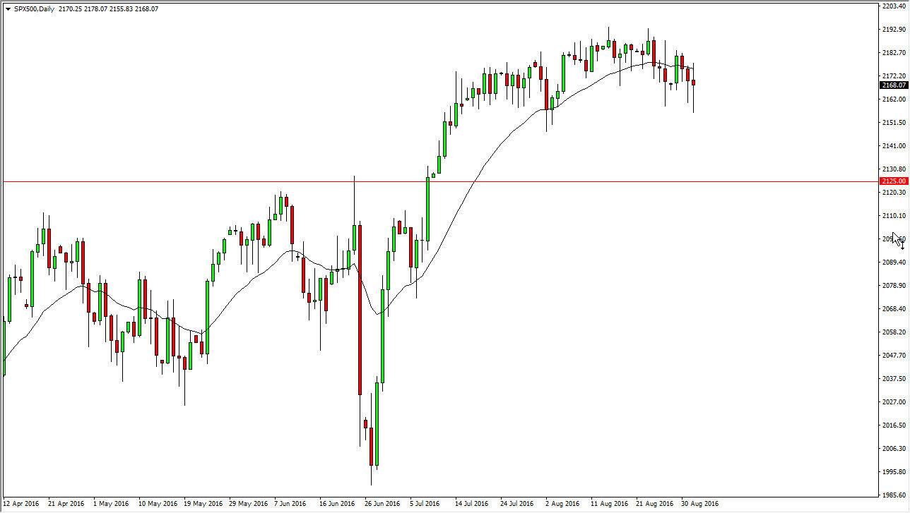 The S&P 500 had a very volatile session on Thursday, as we continue to bounce around in fairly thin markets. On top of that, you have to keep in mind that the jobs number comes out today so that of course has liquidity off a bit as most traders will be willing to put on heavy new positions ahead of that vital announcement. However, I’m the first to admit that a break above the top of the range for the Thursday session is very bullish, and could very well set the tone for the entire month of September as volumes pick back up after the vacation season. A break down below the bottom of the candle could be fairly negative, but I believe that there is essentially a “floor” in this market somewhere near the 2125 handle.