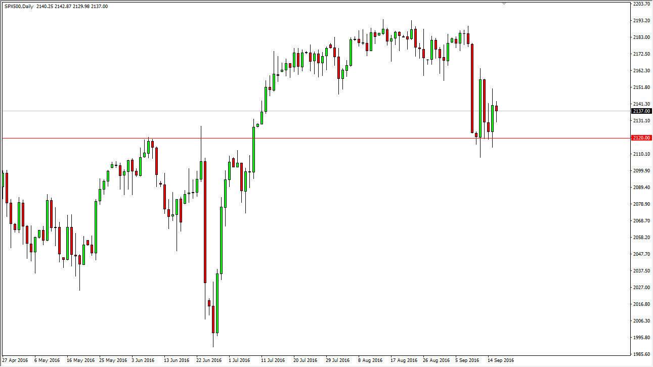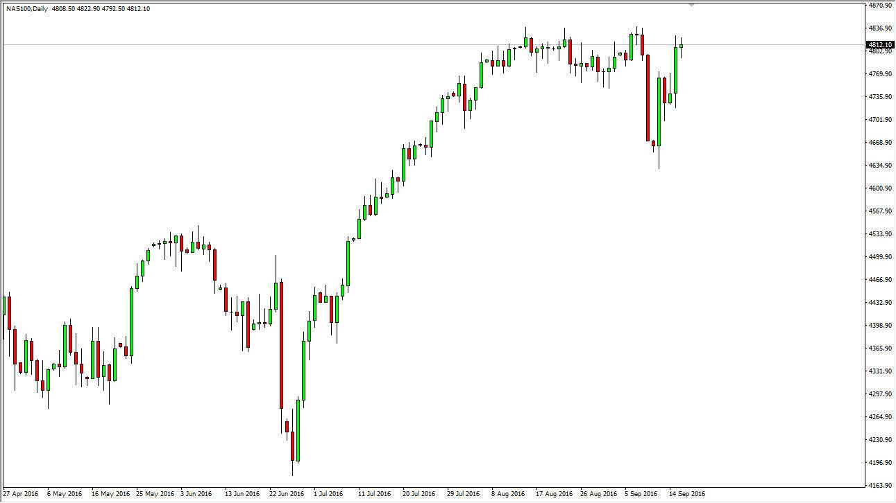 In the NASDAQ 100 we can see very similar circumstances, only we are towards the very highs and forming a hammer which of course is a very bullish sign. If we can break out above the 4840 level, I feel that the next move will probably be the 4900 and then a move to 5000 is all but assured which has been my longer-term target for quite some time. We’ve seen quite a bit of a sellers’ market of the last couple of days, but that’s been completely turned around. I think at this point in time the interest-rate expectations are very low, and that of course helps stock markets as the bond markets offer nothing in the way of returns. At this point in time I believe that fundamentals are essentially unimportant, and central bank policy is starting to take over everything in the stock markets. Granted, this tends to lead the bubbles that into very poorly, but at this point in time it does look like we are anywhere near that bubble popping. With this, I remain a buyer.
