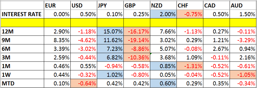 Let’s take a look at the relevant data of currency price changes and interest rates to date, which we compiled using a trade-weighted index of the major global currencies: