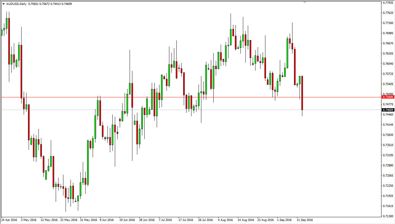 The Australian dollar broke down rather significantly during the course of the session on Tuesday, slicing through the back half of the hammer that had formed on Monday. By doing so, it shows a significant amount of bearish pressure, and as a result it’s likely that the market will continue to go lower from here. However, I do recognize it’s likely that we will have quite a bit of volatility on the way down. This would be accelerated if we can break down below the 0.74 level, and beyond that I believe that a rally from here could be a selling opportunity at the first signs of exhaustion.