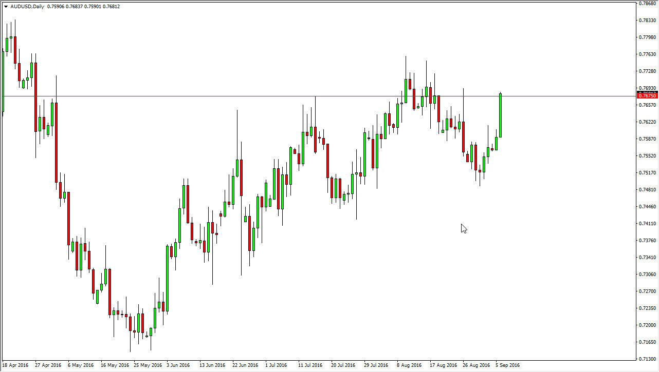 The Australian dollar rose quite rapidly during the session on Tuesday, but as you can see struggled a little bit once we got towards the 0.7675 handle. However, we are closing towards the top of the candle, and with the Reserve Bank of Australia offering quite a bit of volatility due to the interest-rate statement today, it’s likely that we will get some type of move. If we pullback from here, I believe that there is more than a significant chance that we could start buying yet again. A supportive candle after a move below would be a nice buying opportunity.