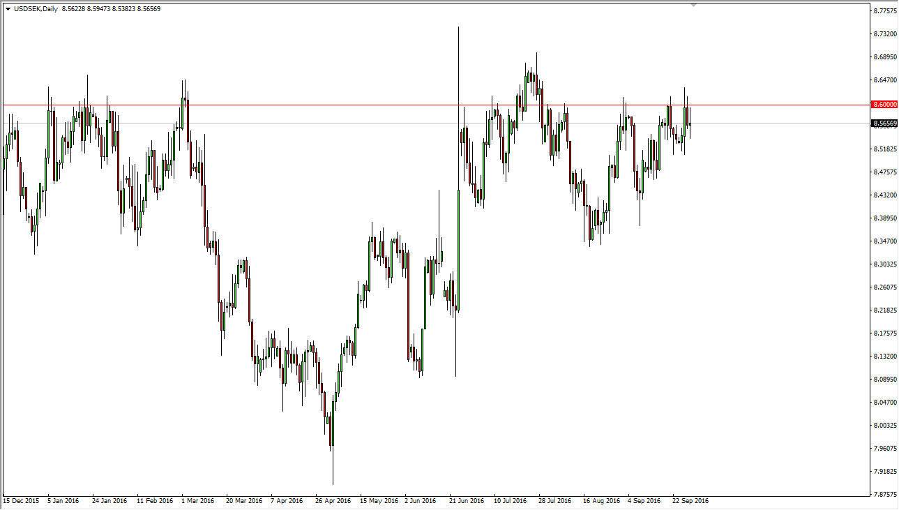 I would also be willing to suggest that perhaps we are trying to build some type of ascending triangle, so with that being the case I think it’s only a matter of time before we not only break out to the upside, but again, reach towards the 9.00 handle as the measuring of the ascending triangle would suggest. I do recognize that the spread on this pair is a little bit higher, but quite frankly if you keep in mind that the value of each tick is much smaller. On top of that, you have to keep in mind that the USD/SEK is actually part of the US Dollar Index, so in technical terms, it is actually a major pair. A lot of Forex traders avoid this pair though, and I think they do at their own peril. Quite frankly, it does tend to trend quite nicely over the longer term.