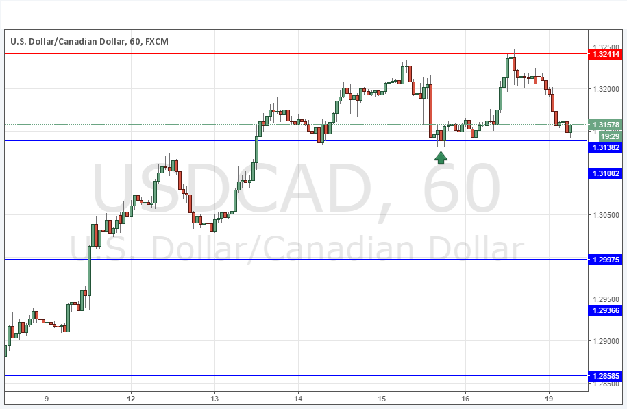 Last Thursday’s signals may have produced a profitable long trade following the bullish rejection of the support level identified at 1.3138, marked by the green up arrow in the chart below. The obvious place to take profit would have been the resistance level at 1.3241.
