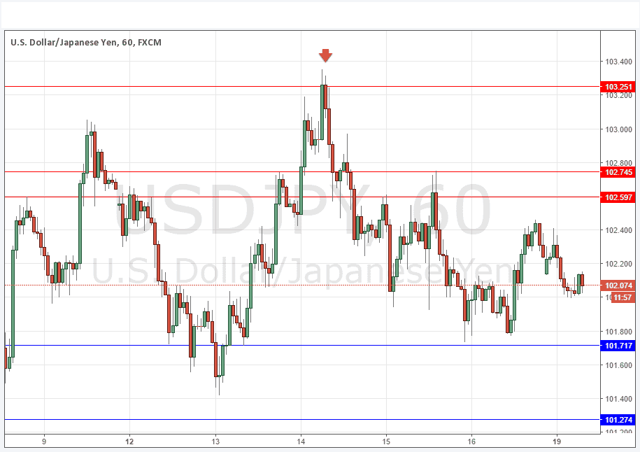 Last Thursday’s signals gave a moderately profitable short trade following the bearish rejection of the resistance level at 102.60, marked in the chart below with a red down arrow.