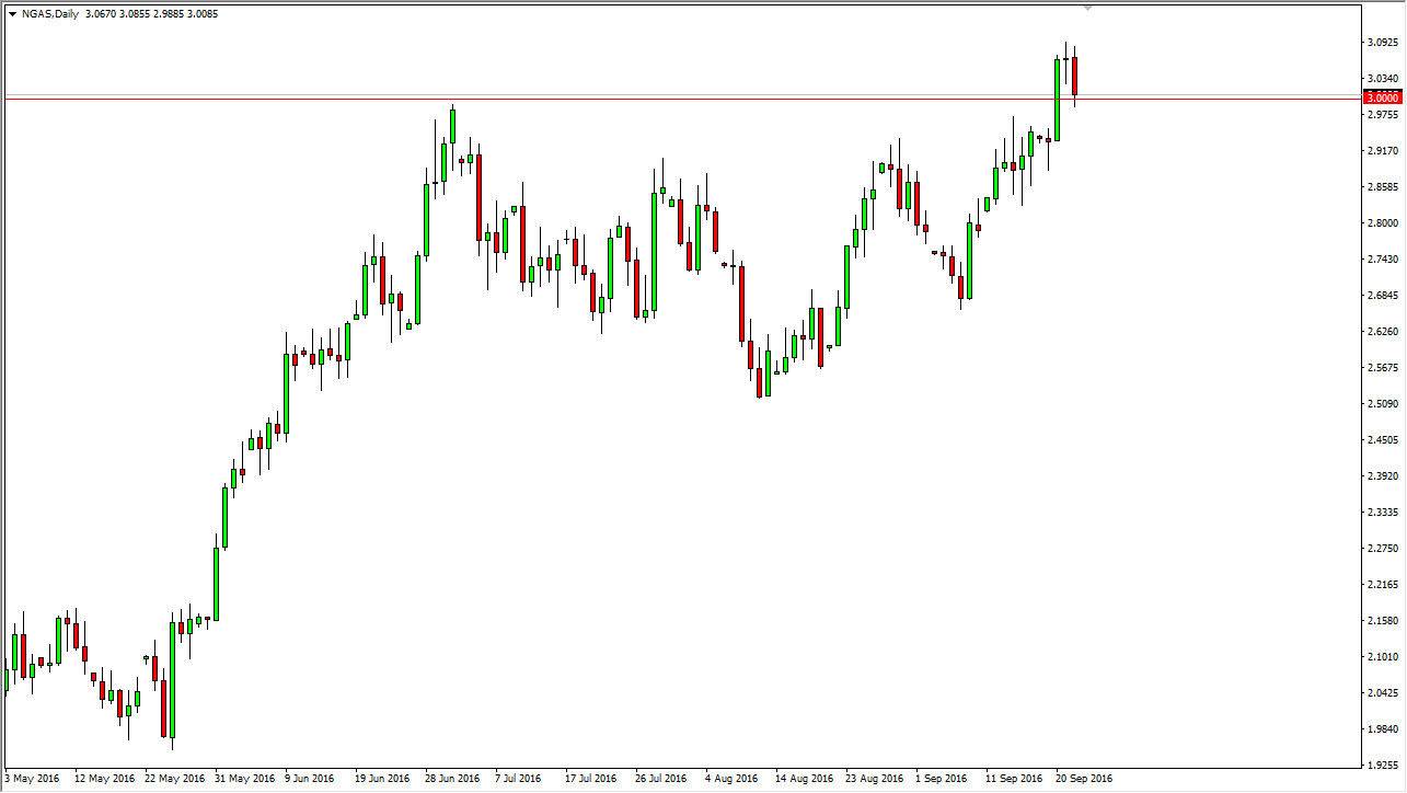 The natural gas markets fell during the course of the session on Thursday, testing the $3 level. This is an area that obviously has a large psychological importance, and on top of that was an area that had previously been resistive. The fact that we are broken above there tells me that we continue to go higher over the longer term. With this being the case, I believe the fact that we bounced off of that area shows that the buyers are very willing to get involved in this market so I expect this market to go higher from here. You may have to go to shorter-term charts in order to start buying, but ultimately it looks like you will get your opportunity, at least for the time being, and as a result I remain bullish. I believe that there is plenty of support all the way down to at least the $2.90 level below.