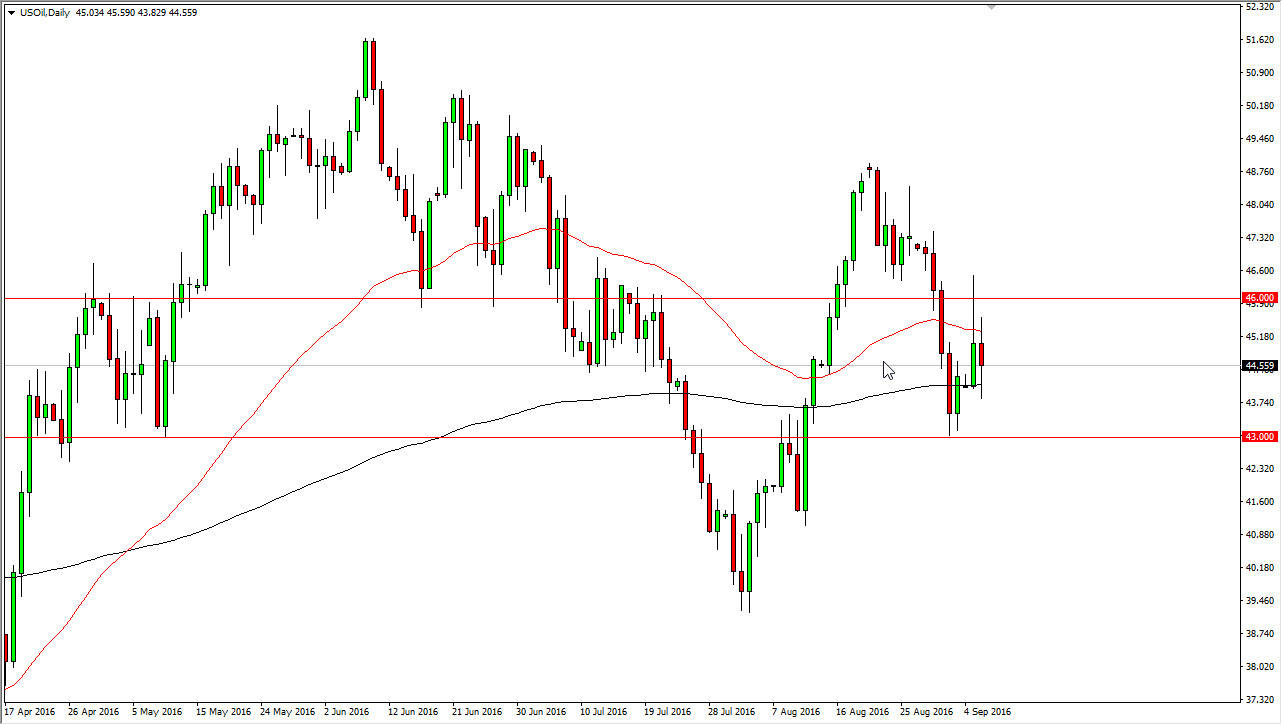 The WTI Crude Oil market went back and forth during the course of the day on Tuesday, as we continue to see quite a bit of volatility. The resulting candle was very neutral and hand two long wicks, which tells me just how confused the market is at this point in time. I believe that we’re going to continue to consolidate between the $43 level on the bottom, and the $46 level on the top. With this being the case, I think short-term trading continues to be the only way to handle this market, as volumes are just now starting to pick up from the summer season. With that being the case, I think that you will have to look to the range bound systems in order to make money in this market.