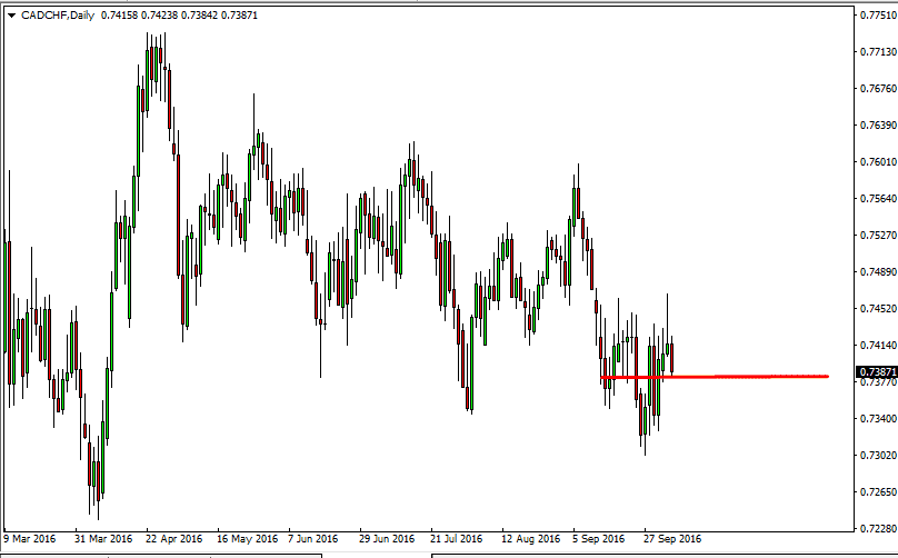 The CAD/CHF pair has been interesting recently, as the market has been grinding lower. This is a market is going to be correlated with oil to a point, after all the Canadian dollar is part of it, but the reality is that it’s more or less a “response/risk off” type of situation. The Swiss franc of course is a safety currency while the Canadian dollar is highly leveraged to commodities. With this, I feel that it’s only a matter time for this market breaks down yet again. Rallies could be selling opportunities as well, as we continue the long gradual grind lower.