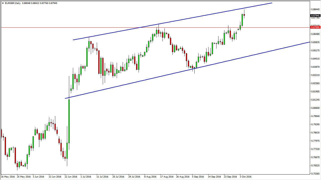 I think that the target is going to be the 0.90 level eventually, but it is can take a while to get there. We are a little bit overextended at the moment, so a slight pullback towards the 0.87 level would make quite a bit of sense. At that point in time, if we can form some type supportive candle or a nice-looking bounce, I’d be more than willing to start buying. That should continue to be the case though, buying on dips going forward. I have no desire to sell this pair at this moment in time.