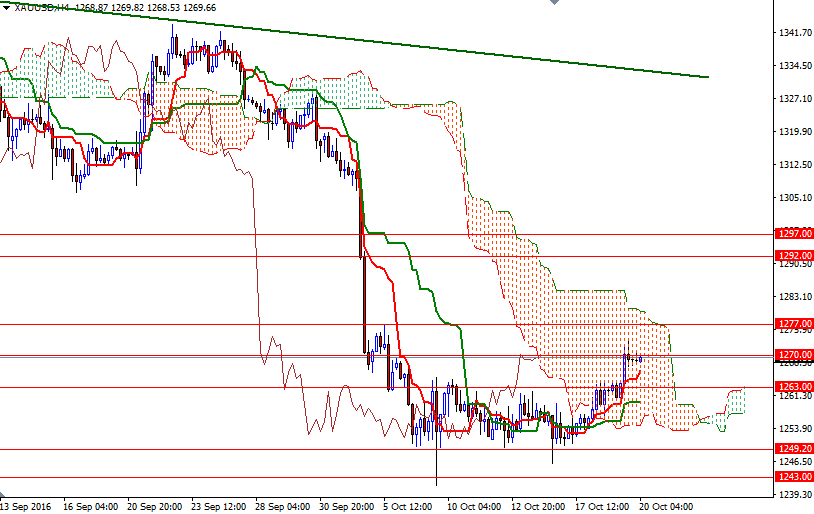 The short-term outlook suggests that there is a possibility of prices marching towards the 1277 level as long as the market stays above the 1265/3 area. Breaching this barrier which happens to be the top of the 4-hourly cloud is essential for a bullish continuation towards 1285. Only a daily close above the 1285 level could provide the bulls the extra fuel they need to march to 1292 where the daily Kijun-Sen (twenty six-period moving average, green line) resides.