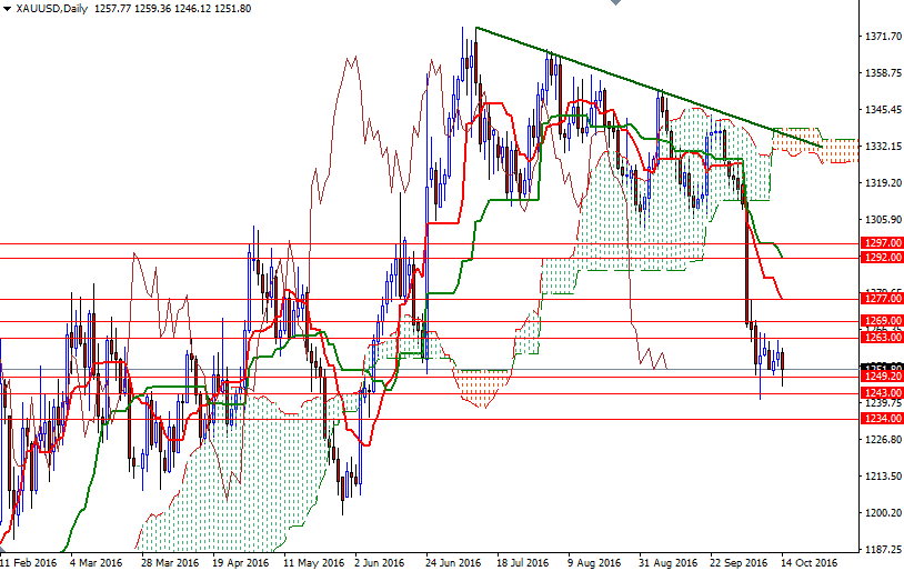 However, until the market confidently break below 1243/0 gold's downside potential may be limited. If the market dives below 1240, then 1234/1 could be the next stop. Breaking down below 1231 could add to pressure on prices and eventually drag XAU/USD to the 1225 support. Once below 1225, the bears will be aiming for 1221.40 and 1215.50-1213, where the top of the weekly cloud resides. On the other hand, if the XAU/USD pair manages to hold the aforementioned key support, we might see a push up to the daily Tenkan-Sen (nine-period moving average, red line) at 1277. But of course, in order to reach there, the bulls have clear nearby resistances such as 1265/3 and 1270/69. 1277 will be the key level for the bulls to pass in order to challenge the bears on the next battle field at 1285. A failed assault on this resistance could be a good place to seek a short trade.