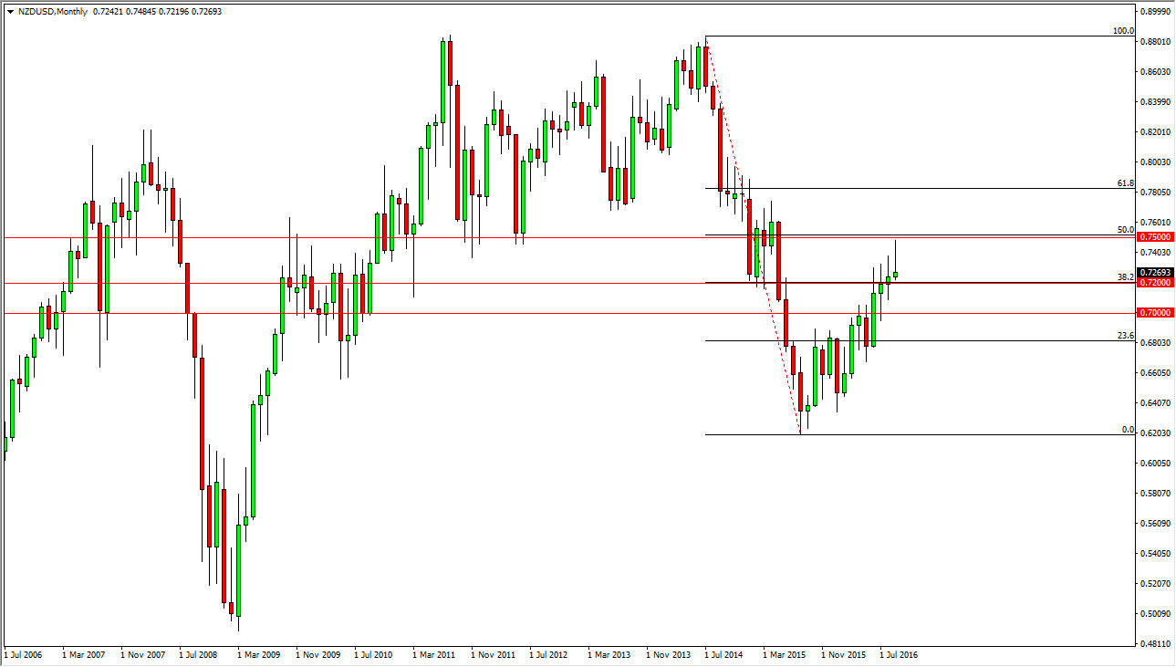 These September candle has formed a massive shooting star, something that you don’t see very often on monthly charts. Because of this, I believe that if we break down below the 0.72 level, we are going to go down to the 0.70 level, where I would expect to see quite a bit of support. However, when I look at this market I cannot help but notice that overall we have been falling, and the shooting star touched the 50% Fibonacci retracement level which was also the 0.75 handle. Because of this, I think we are going to continue to go lower in the short-term because there are so many uncertainties out there when it comes to the economic landscape.